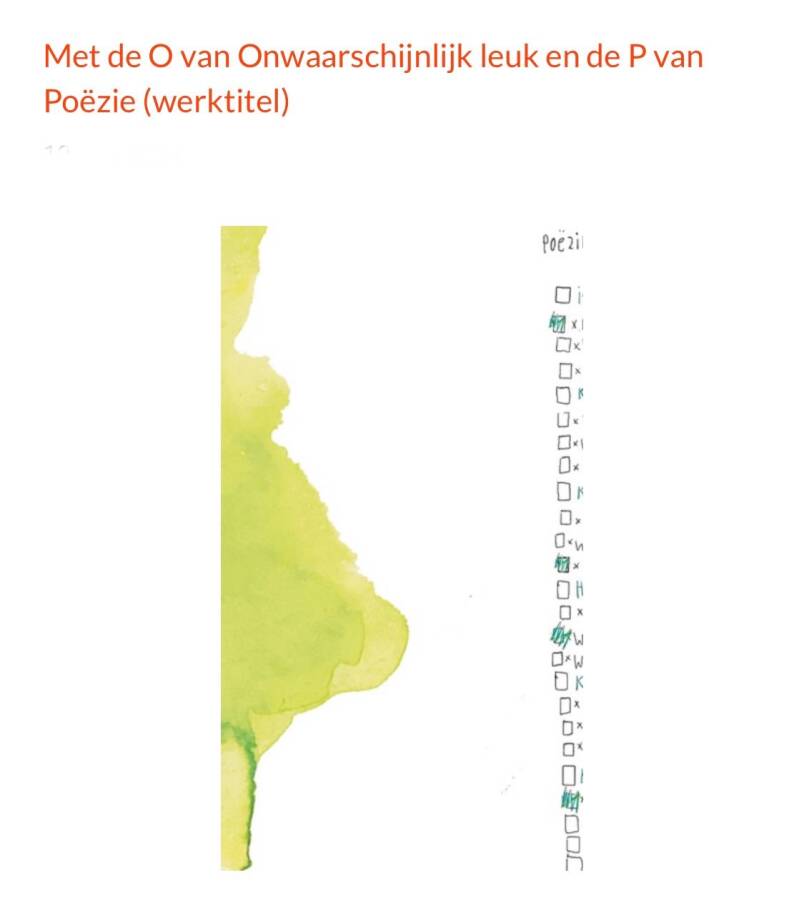 *ABC werkvormen poëzie, kunst-begint-met kijken-boek 'Met de O van Onwaarschijnlijk leuk en de P van Poëzie' (werktitel) ism met Sandra de Weijze. (verder nog geheim tot we een uitgever hebben)